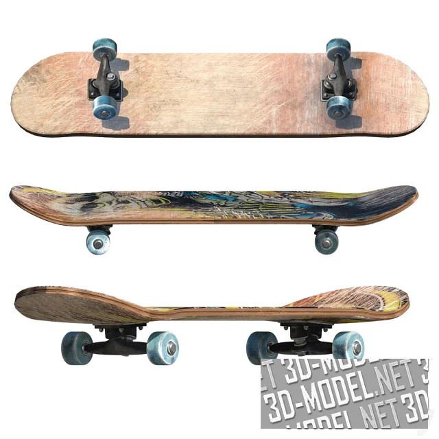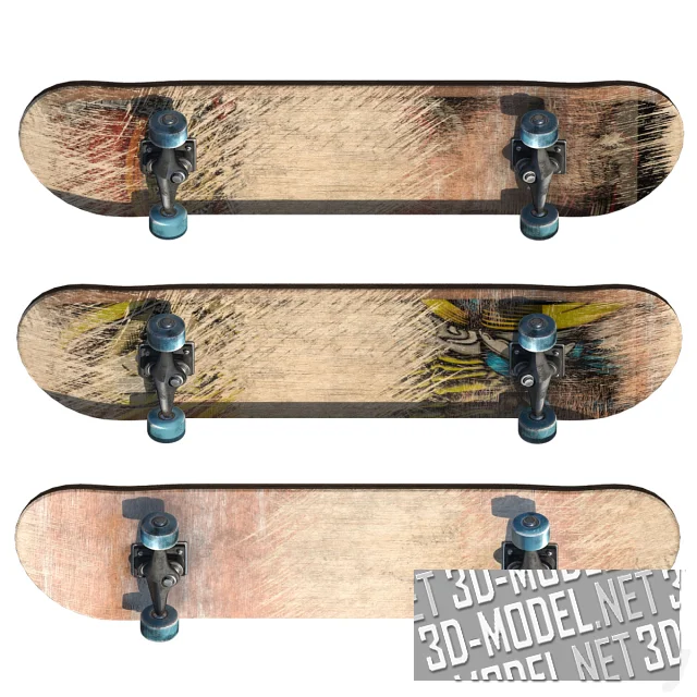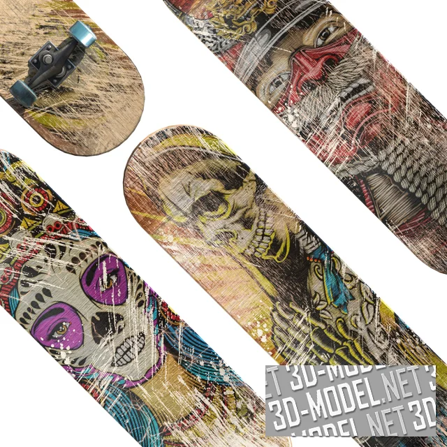 Три скейтборда со следами активной эксплуатации и разными рисунками на верхней плоскости. Рисунки выполнены в технике цветных татуировок с элементами мексиканского, японского и американского стилей.