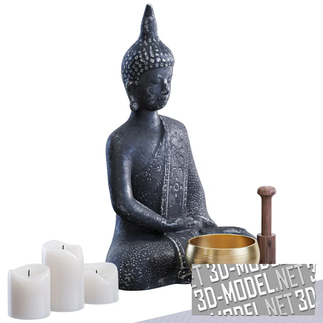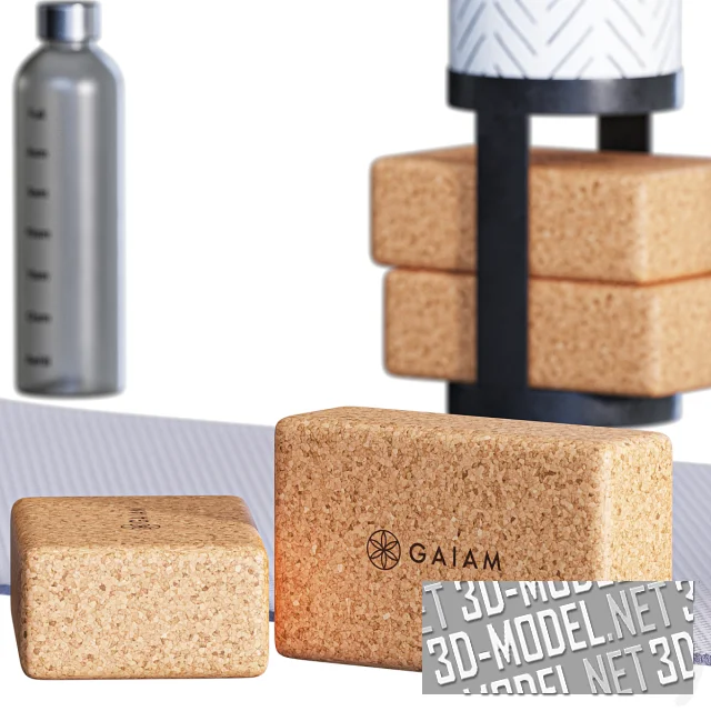 Колоритный набор для занятий медитацией и йогой в индийском стиле. В наборе: светло-серый и бледно-голубой карематы, цилиндрический мягкий валик-подушка в сером чехле, свечи, золотистая ступка с пестиком, бутылка для воды, подставки для свернутых карематов, кирпичи из пробкового дуба для занятий йогой, рустикальная статуя Будды.