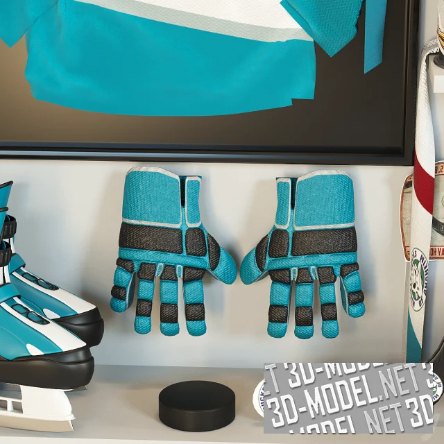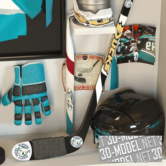 Набор экипировки и принадлежностей для игры в хоккей на льду. В наборе: форма команды «Anaheim Ducks», перчатки, ботинки с коньками, клюшка, шайба, шлем, фанатские шарфы, постеры, серебристый кубок, картонная кисть руки с вытянутым указательным пальцем, модель хоккейных ворот.