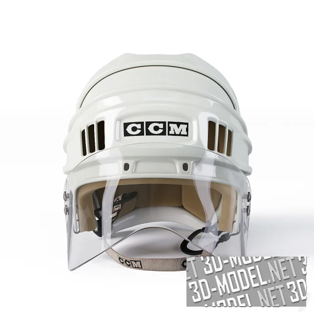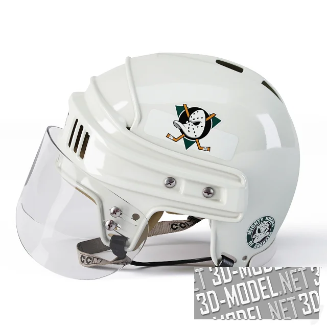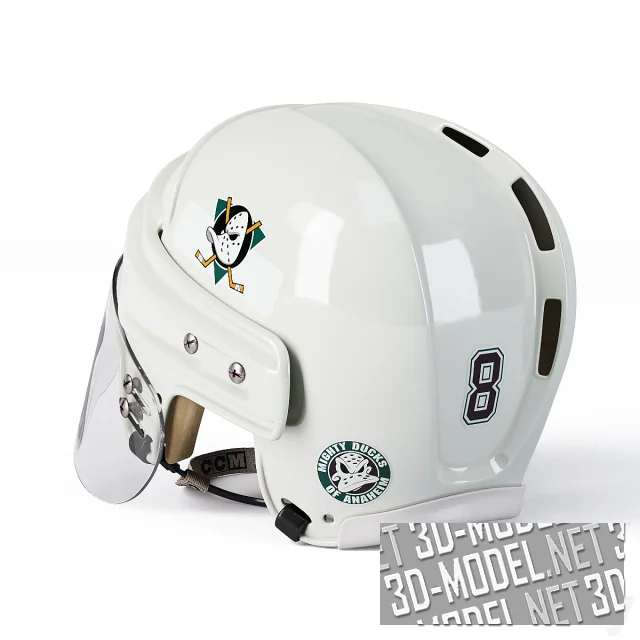 Современный спортивный хоккейный белый шлем Anaheim Ducks CCM, с прозрачным щитком, закрывающим верхнюю часть лица игрока. На боковые поверхности шлема нанесены деколи с изображением хоккейной команды Anaheim Ducks. На задней части номер игрока - черная цифра «8».