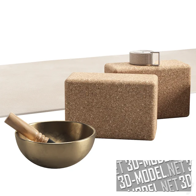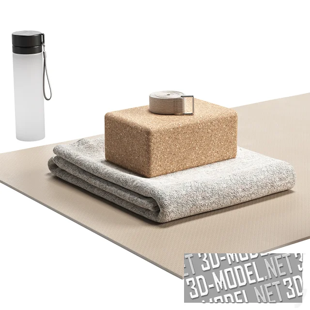 Комплект, состоящий из аксессуаров для занятий йогой и медитацией. Состоит из коврика, валика, подушки, полотенца, бутылки с водой и др. Этот инвентарь может быть использован для реалистичного наполнения студии йоги, фитнес-зала, спортзала и пространства для занятий в домашних условиях. Размер коврика 200 x 76 см.