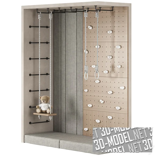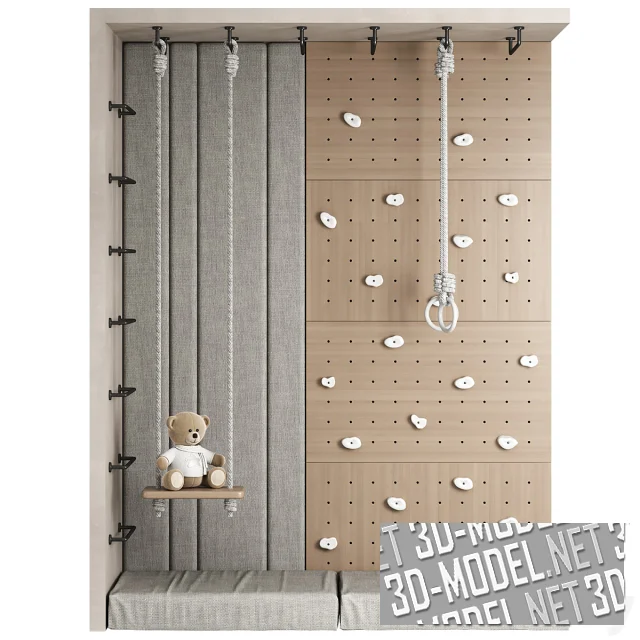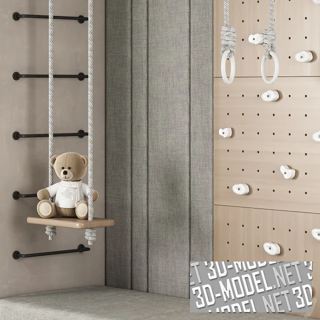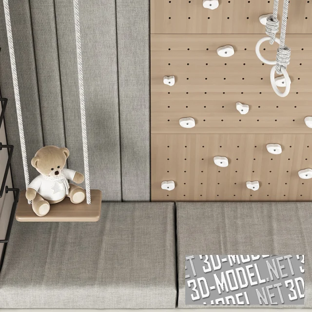 Небольшая современная игровая зона в детскую комнату, со скалодромом, спортивными матами в серых чехлах, лестницей на стене и потолке, веревочной качелью и гимнастическими кольцами. Белые полимерные захваты на скалодроме закреплены на прямоугольных деревянных стеновых панелях. Часть стены отделана вертикальными мягкими панелями разной ширины, в светло-серой обивке. Лестницы изготовлены из черных металлических скоб, закрепленных на стене. На деревянном сиденье качелей сидит мягкий игрушечный медвежонок в белом свитере.