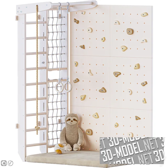 Современный спортивный уголок для детской комнаты, со скалодромом, шведской стенкой, сеткой для лазания, гимнастическими кольцами, канатом и турником. Внизу уложен прямоугольный мягкий мат. На мате игрушечный мягкий ленивец и мяч. Шведская стенка представлена в двух вариантах цвета: белая и дерево под лаком. Скалодром набран из квадратных стеновых панелей сливочного цвета с круглыми отверстиями для крепления криволинейных элементов захватов охристых оттенков.