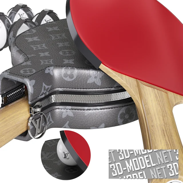 Эстетичный премиальный набор шаров и ракеток для пинг-понга в кожаных чехлах от Louis Vuitton и Fr People Lifestyle. Логотип Louis Vuitton нанесен на торцы рукояток ракеток и на поверхностях белых шаров. Кожаные чехлы для пары ракеток и ременные держатели для четырех шаров имеют принт с фирменным паттерном Louis Vuitton. Представлено два варианта наборов, в сочетаниях: коричневый с золотистым и темно-серебристый с серебристым.