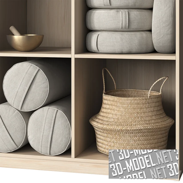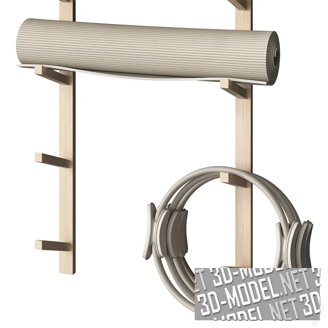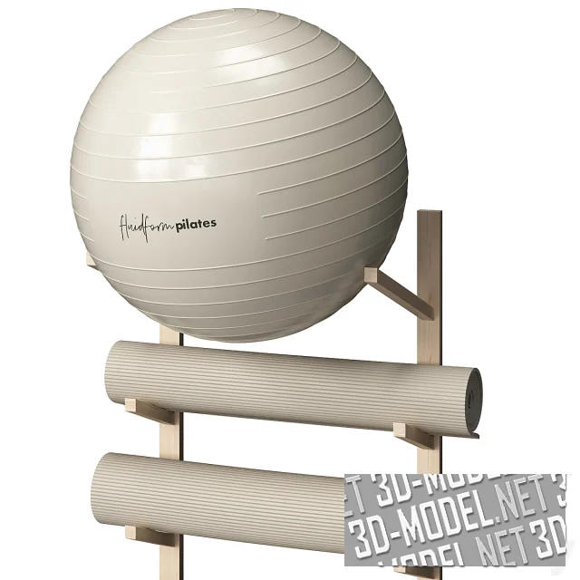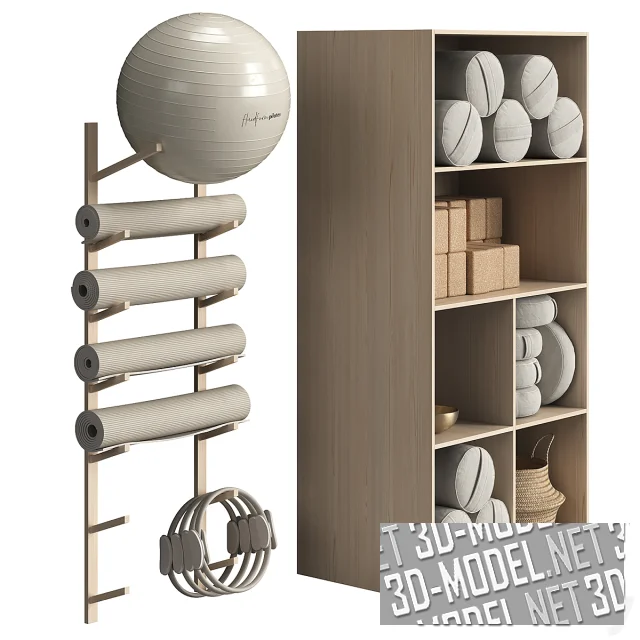 Два деревянных стеллажа со спортивным инвентарем. На одном стеллаже коврики для йоги, резинка и фитбол. На другом – специальные валики, корзины Ikea FLADIS, KRALLIG и прочие аксессуары. Набор подойдет для реалистичного наполнения спортзалов и различных фитнес центров.