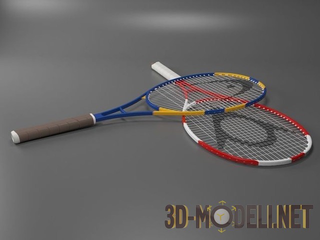 3D-модель двух теннисных ракеток: одна марки Head, сине-желтого цвета с коричневой обмоткой, другая Dunlop, красно-белая с белой обмоткой. Текстуры присутствуют в архиве.