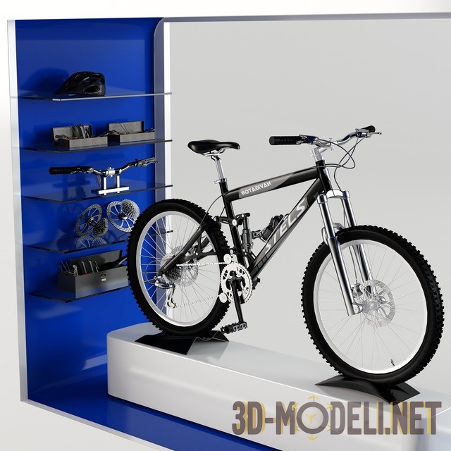 Витрина для велосипедного магазина. На белом подиуме установлен велосипед. Рядом стоит манекен в спортивной экипировке. На полках сбоку разложены некоторые детали и комплектующие. Вся витрина размещена в конструкции белого цвета. Снаружи конструкции стенда находится небольшая консоль с компьютером и стул. Все элементы созданы в гармоничном сочетании черного, серого, насыщенного синего и белого цвета.