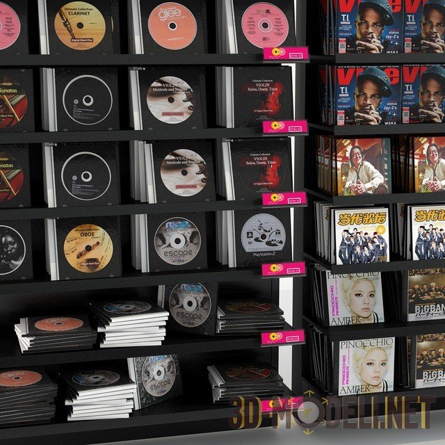 Три витрины для отдела продажи компакт-дисков. На небольших полках черного цвета расположились коробки с компакт-дисками. На передней плоскости каждой полки есть ярлык малинового цвета. Обложки компакт-дисков представлены в ассортименте, что придаст естественность и детальность проекту.
