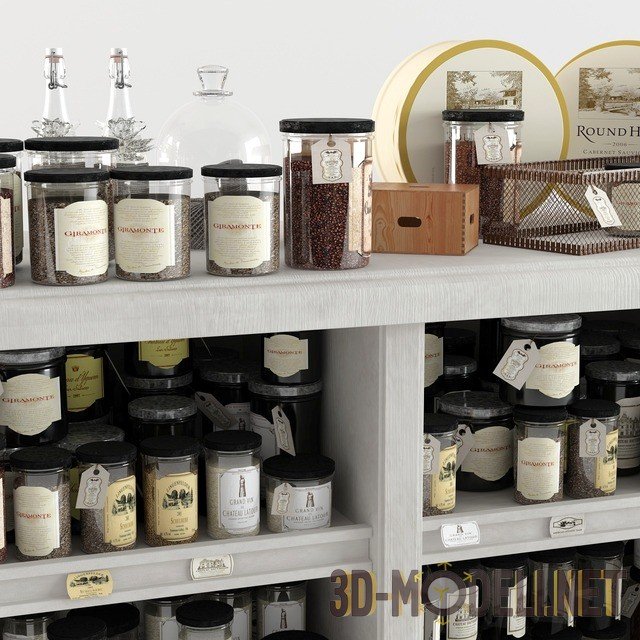 Стеллаж-витрина в стиле прованс, подойдет для оформления чайной лавки или подобного магазина (отдела). Масса небольших баночек с ярлычками и этикетками в несколько рядов стоят на полках из белых деревянных плит. На верхней полке, декорированной фигурной кромкой, стоят баночки покрупнее, несколько фигурных бутылочек, пара круглых картонных коробок и несколько небольших ящичков. На передних плоскостях полок, в специальных пазах расположены ярлычки-ценники.