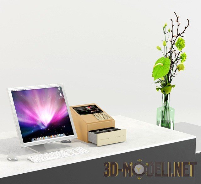 Декоративный прилавок в эко-стиле. Двухъярусная тумба облицована вертикальными деревянными планками разной ширины, белого и состаренного серого цвета. Верхние плоскости столешницы глянцевые. На ней стоят компьютерный монитор и кассовый аппарат. На нижней столешнице ваза зелёного стекла с букетом из веток, зелёных цветов и листьев.