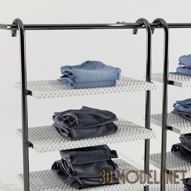 Система подвесных полок для торгового зала магазина. На чёрной, металлической, горизонтальной скобе-кронштейне находятся две группы подвесных полок, по пяти в стойке. Плоскость полок изготовлена из белого перфорированного металлического листа с отбортированным периметром. На полках помещена вещи из серого и голубого коттона.