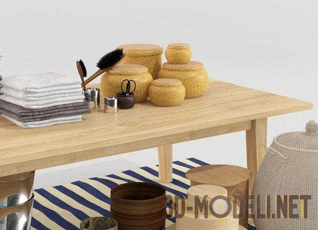 Набор для наполнения интерьера отдела, торгующего товарами для дома. На прямоугольном коврике с тёмно-синими полосками стоит деревянный стол с разнообразными декоративными вёдрами, коробками-туесками, плетёной корзиной с крышкой и кашпо. На столе две стопки со сложенными полотенцами белого и коричневого цвета, две щётки и набор светлых деревянных горшков с крышками.
