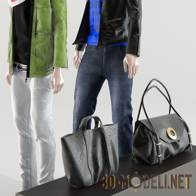На двух разновысоких прямоугольных подиумах серо-графитового цвета стоят два одетых в модные вещи и солнцезащитные очки манекены, мужской и женский. Рядом две чёрные сумки. Модель хорошо подойдёт для обустройства интерьера бутика или магазина одежды.