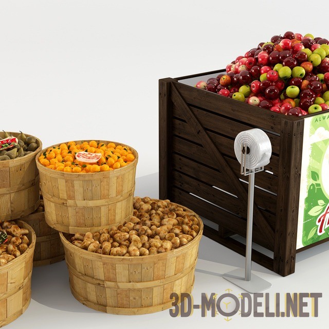 Набор для наполнения пространства овощного магазина. Три больших деревянных ящика с арбузами, большой, тёмно-коричневый деревянный контейнер с рекламным постером на боковой плоскости и с разноцветными яблоками внутри, три больших и две поменьше деревянные кадки с картофелем, мандаринами и грушами, а также стойка с рулоном полиэтиленовых пакетов. Смотрится очень реалистично и достоверно.