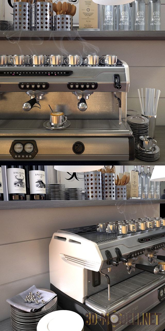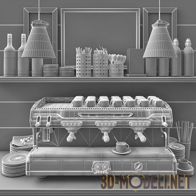 Набор для магазина, кафетерия или ресторана, с кофемашиной Franke T400 3. Сет полностью оборудован: здесь присутствуют подвесные светильники Glis Pendant Lighting Collection, бутылки с вином, чашки с кофе и другая посуда (ножи, ложки, вилки), а также салфетки и другие необходимые аксессуары.