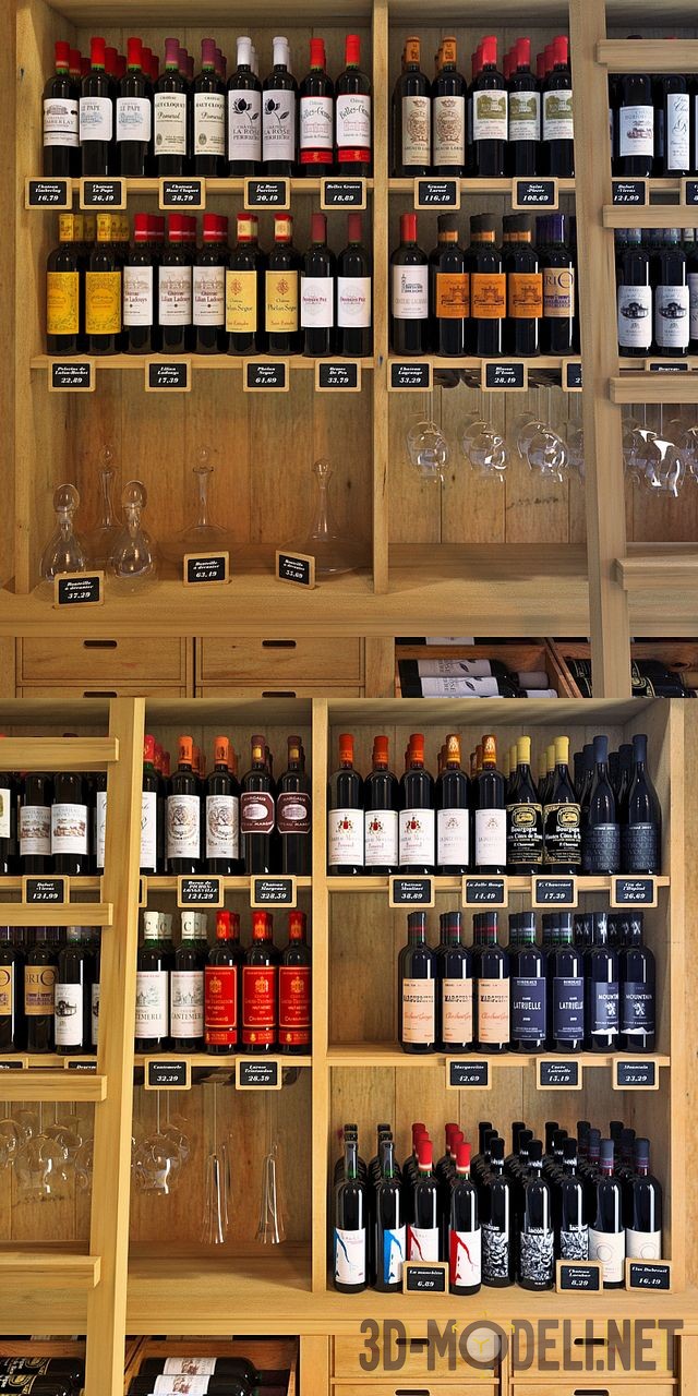 Витрина для винного бутика. Высокая, деревянная, с лестницей, помогающей добраться до верхних полок с ячейками, заполненными винными бутылками. На среднем уровне стеллажа бутылки стоят вертикально, на верхних – горизонтально, пробками вперёд. В ячейках нижних полок расположились выдвижные ящики и полки с подвешенными бокалами и пустыми стеклянными графинами. В центральной части нижнего яруса фасады выдвижных ящиков украшены надписями с названиями вин. Надписи выполнены оригинальными шрифтами, методом выжигания лазером. Для этикеток винных бутылок использованы реальные винные этикетки от французских вин.