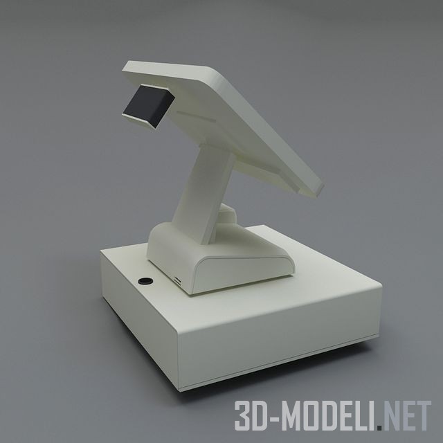 Современная кассовая система Point of Sale (POS). Включает в себя, собранные в блок: кассу в виде горизонтального стального ящика для денег, со встроенным замочком, портативный принтер для чеков и монитор с сенсорным управлением. Наружные поверхности прибора выкрашены в светло–серый цвет.
