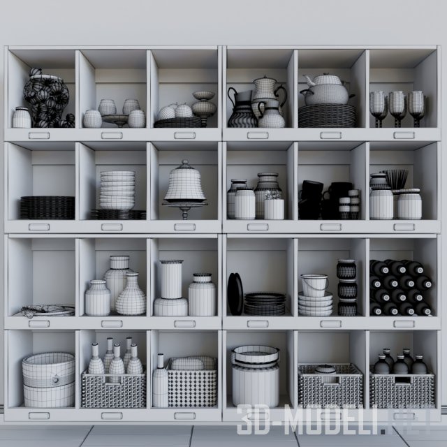 Универсальный стеллаж с открытыми полками, белого цвета. Заполнен предметами посуды и продуктами с напитками. Реалистичная и качественная модель с текстурами в архиве.