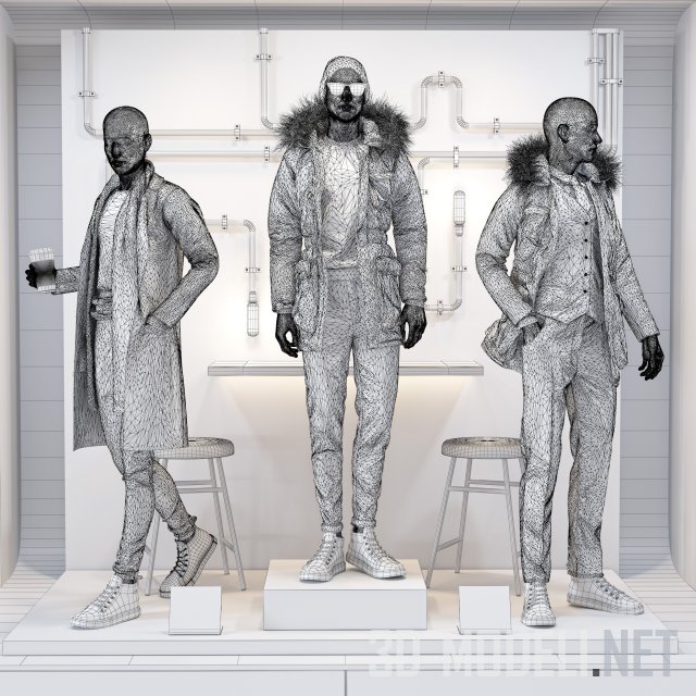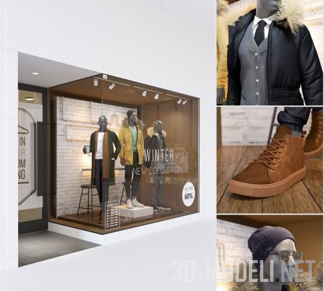 Современная магазинная витрина с мужскими манекенами. Магазин мужской одежды, на манекенах представлен костюм, пальто и куртки с меховыми капюшонами. Реалистичная модель с текстурами в архиве.