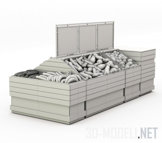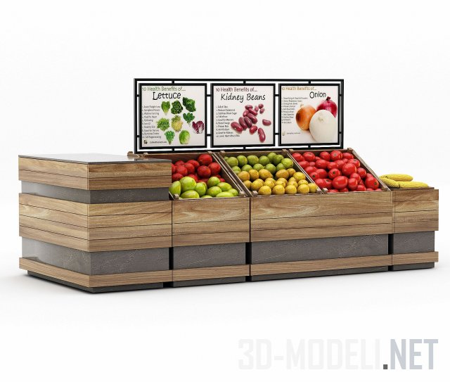 Для проектирования интерьера магазина или рынка пригодится этот большой деревянный лоток с фруктами и овощами. В его отсеках лежат бананы, картофель, баклажаны, огурцы, морковь и кукуруза. Над лотком укреплены небольшие стенды с ценами.