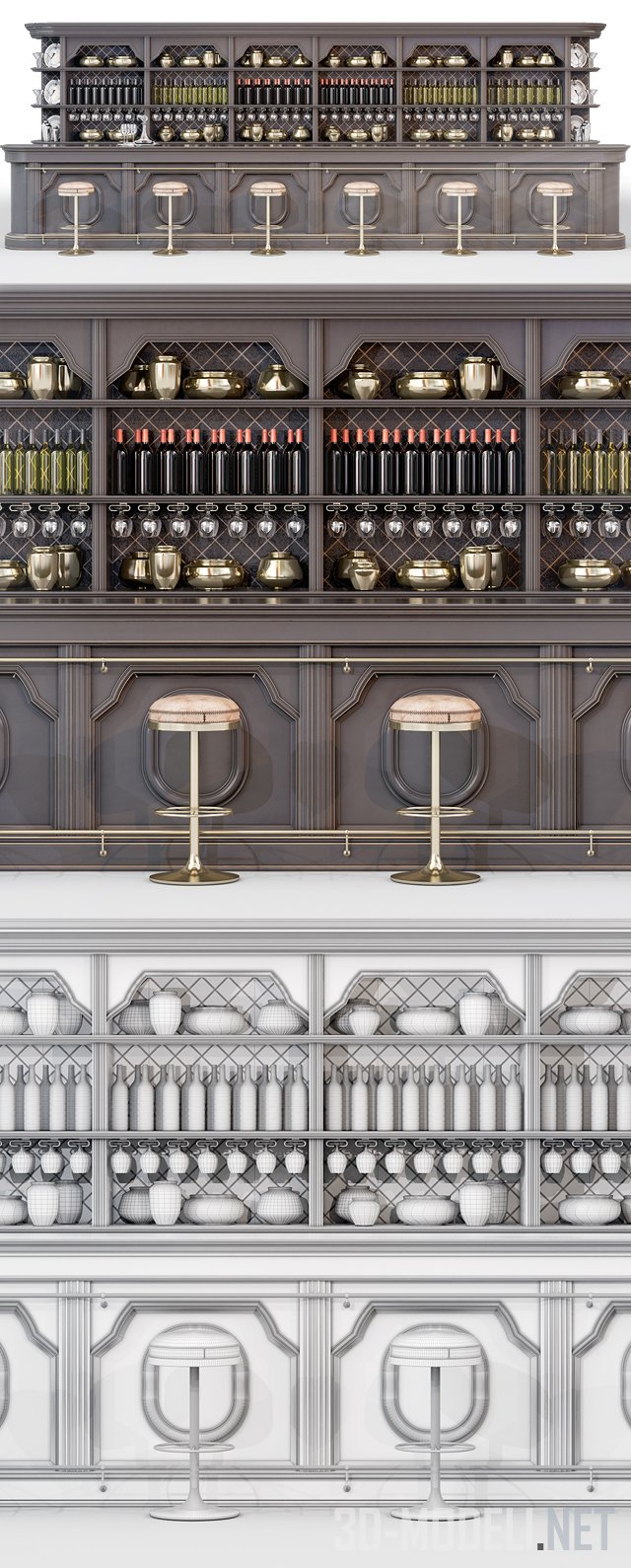 Левая и правая части полок и барной стойки имеют радиусные скругления, что придает конфигурации мебели дополнительные декоративные качества. Золотистый металл в отделке отлично сочетается с крашенным в цвет какао деревом. На полках размещены бутылки с винами, стеклянная и медная посуда.