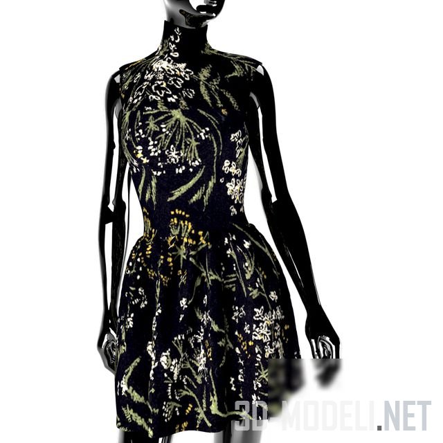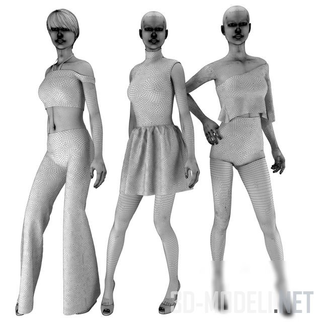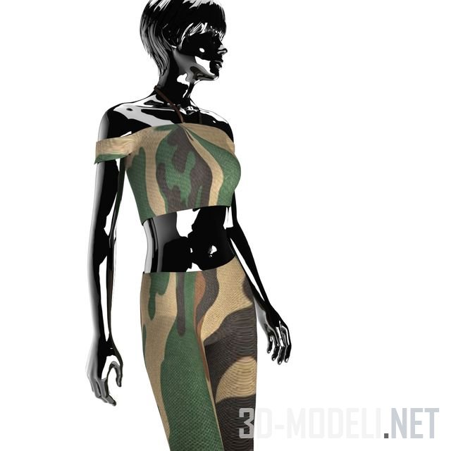 Три женских манекена черного глянцевого цвета в различной одежде. На одном манекене надет трикотажный топ и брюки камуфляжного цвета, на другом синий топ и короткая юбка, на третьем – пестрое платье.