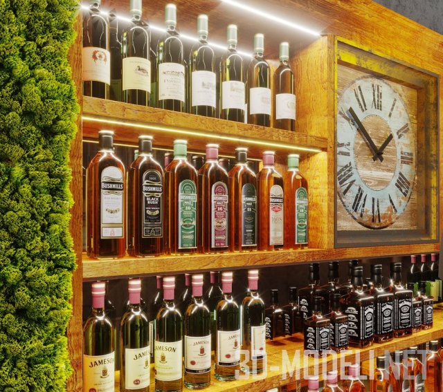 Деревянная барная стойка из состаренного дерева карамельного цвета. На полках стоят множество бутылок с виски. Большие часы с римскими цифрами дополняют впечатление. Можно использовать в интерьере в стиле эко или лофт.