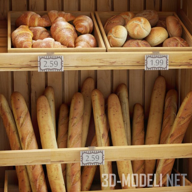 Стеллаж из деревянных планок коричневого или желтого цвета. На полках лежат разнообразные хлебобулочные изделия: длинные румяные багеты, аппетитные круассаны, батоны с хрустящей корочкой и подовый хлеб.