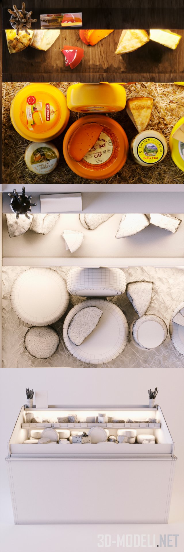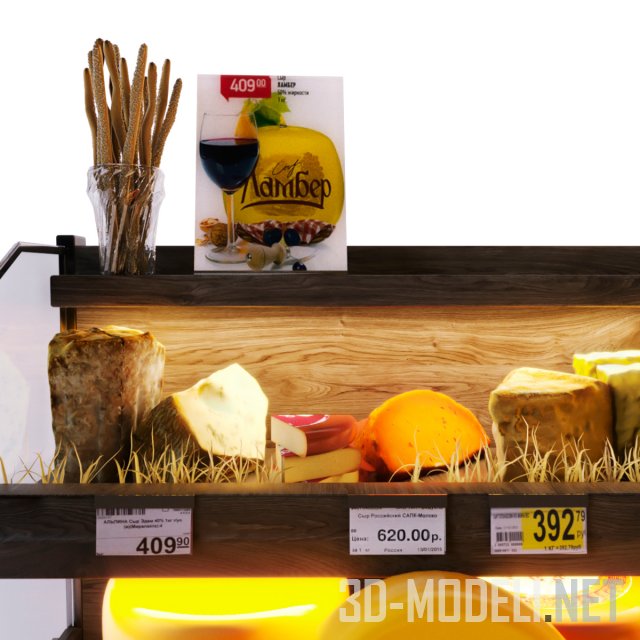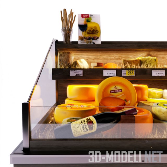 Холодильная витрина с разными сортами сыра и вином. В ассортименте голландский сыр Гауда, Ламбер, Российский, сметанковый, испанский сыр Curado и пр.