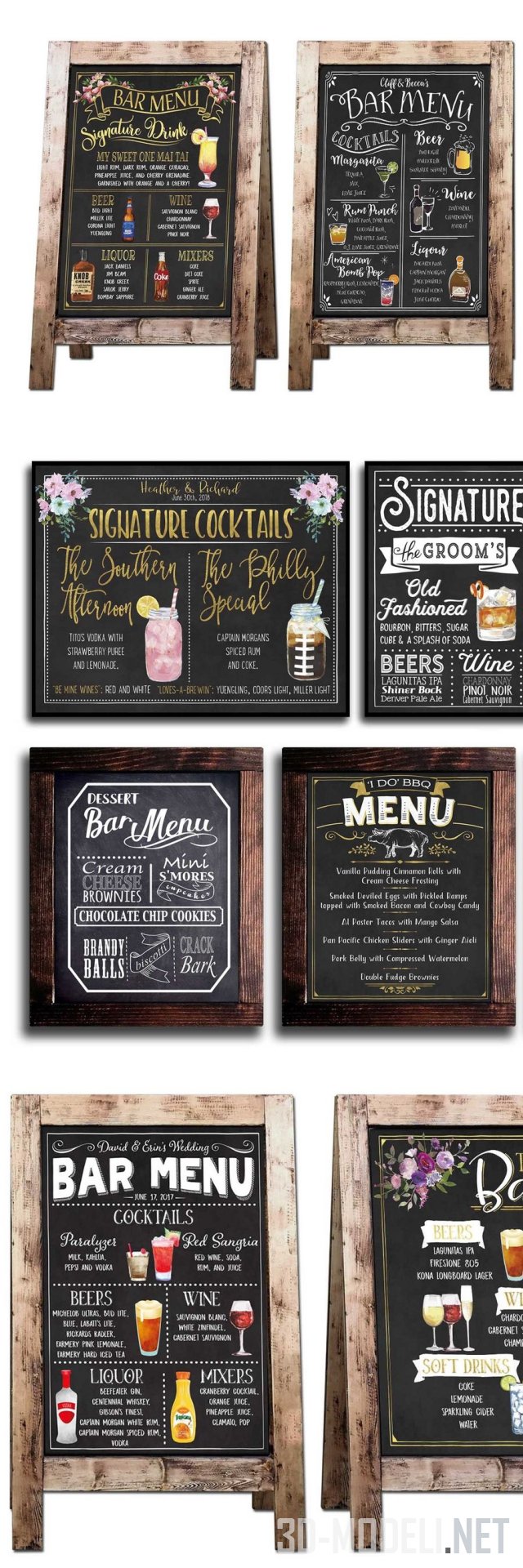 Небольшие рекламные конструкции, таблички и вывески со стильными каллиграфическими композициями в стиле меловых винтажных рисунков на черных графитовых досках. Рамы штендеров выполнены из состаренных деревянных реек. Старое, обожженное дерево присутствует на рамках небольших меню заведений общепита с рекламой и перечнем ассортимента напитков.