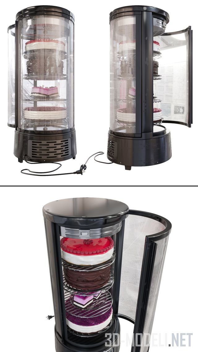 Витрина холодильная кондитерская Bartscher, цилиндрической формы. Витрина графитового цвета, с открытой стеклянной дверью. Внутри витрины на полках стоят большие аппетитные шоколадные и бисквитные, украшенные кремом и ягодами торты. Размеры витрины: 450 x 450 x 983.