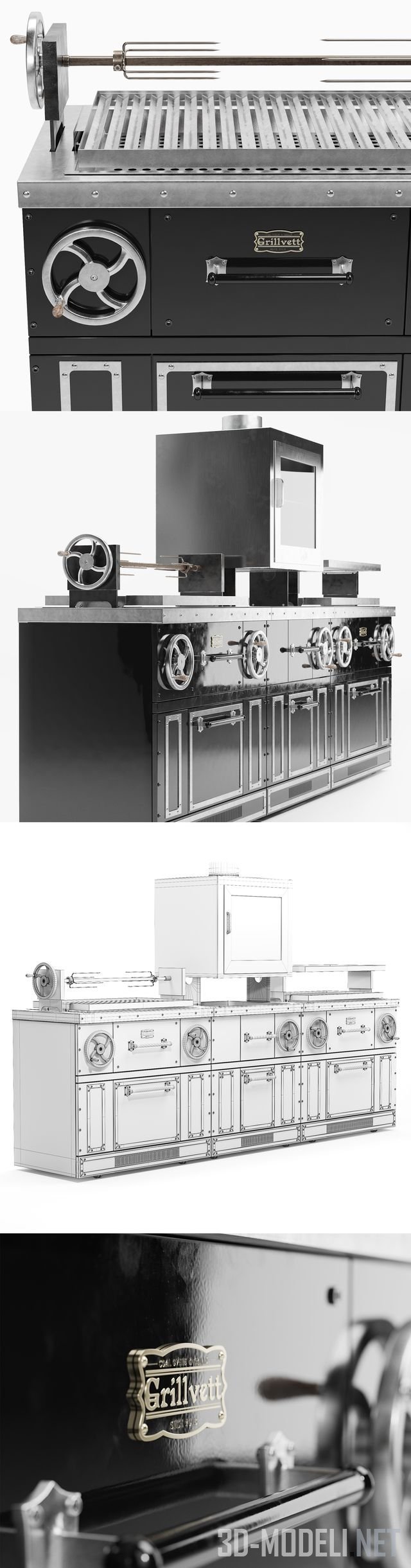 Многофункциональный агрегат с грилем, коптильней и жаровней, модель Grillvett. Габарит изделия: 2800 х 1653 х 600 мм. Три зоны готовки размещены над большой рабочей поверхностью с выдвижными ящиками, створками и органами управления на передней плоскости.