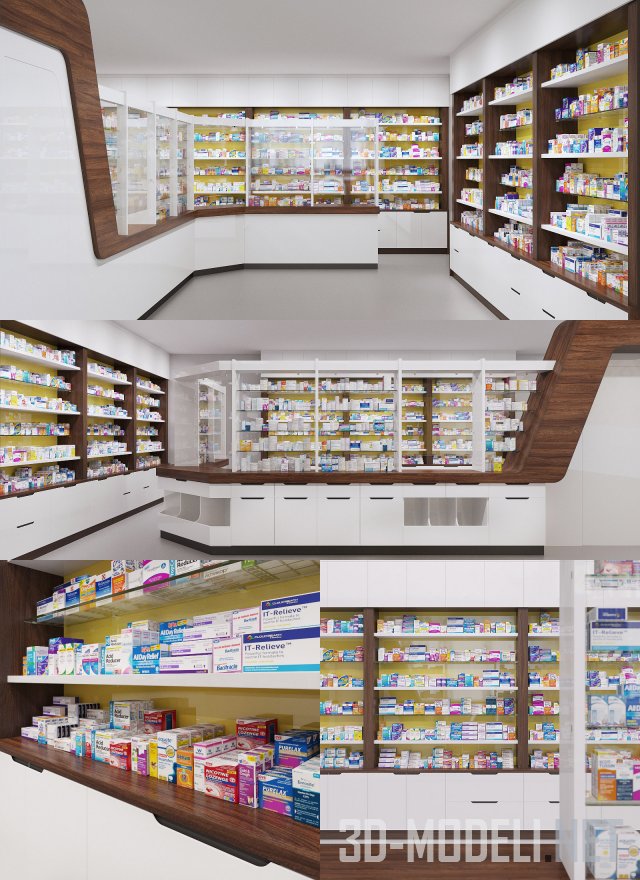 Несколько стеллажей разной формы с полками. На полках расположены лекарства и различные товары, которые обычно продаются в аптеках.