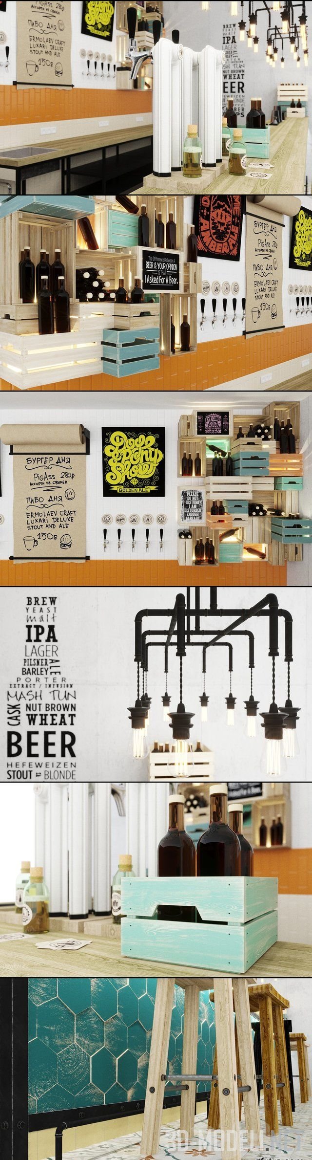 Три подвесных светильника над столешницей бара изготовлены из черных сантехнических труб и фитингов. Разливная пивная колонка на несколько кранов имитирует чугунные радиаторные секции. Система полок на задней стенке бара выполнена из деревянных ящиков для бутылок. Барные стулья - в виде высоких табуретов из дерева с разной тонировкой: беленые, мореные и черные. Передняя плоскость барной стойки отделана шестигранными модулями с потертостями на бирюзовой покраске. Под столешницей размещена скрытая подсветка, создающая дополнительный декоративный эффект.