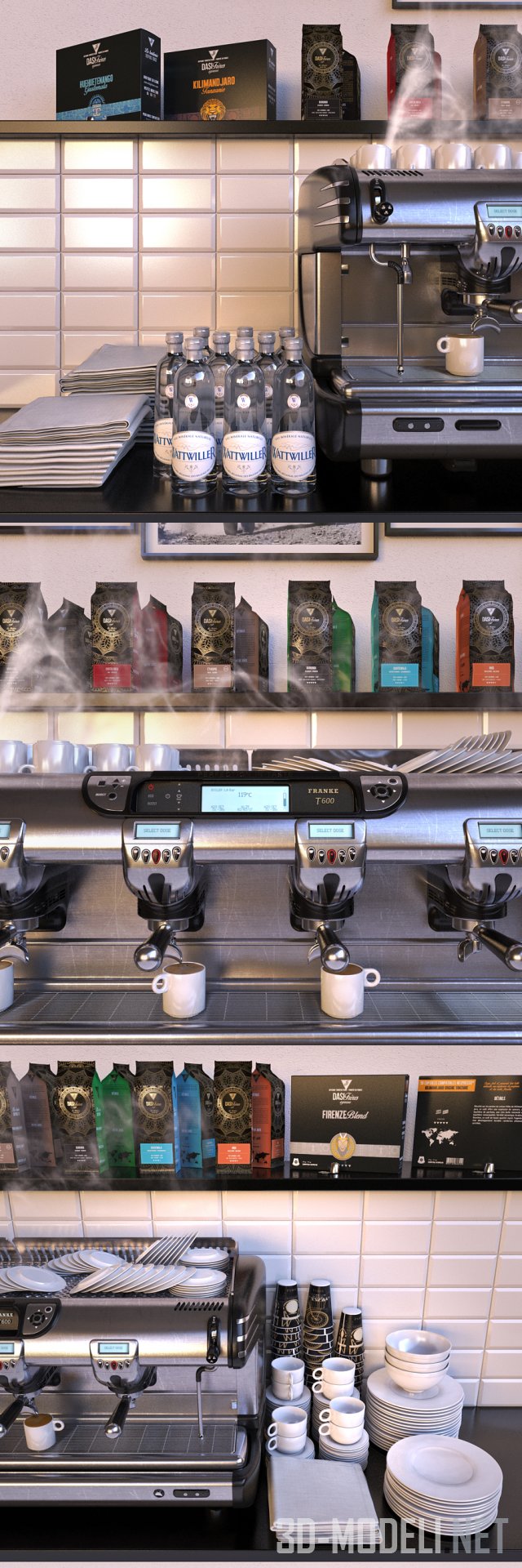 Профессиональная современная кофемашина FRANKE T600 4GR, посуда, аксессуары. Установка на четыре чашки оснащена всем необходимым. Рядом размещены чашки, блюдца, бумажные стаканчики, тарелки, миски, бутылочки с водой, салфетки. На полке коробки с кофе. На стене коллекция фотографий с черно-белыми изображениями старинных гоночных автомобилей.