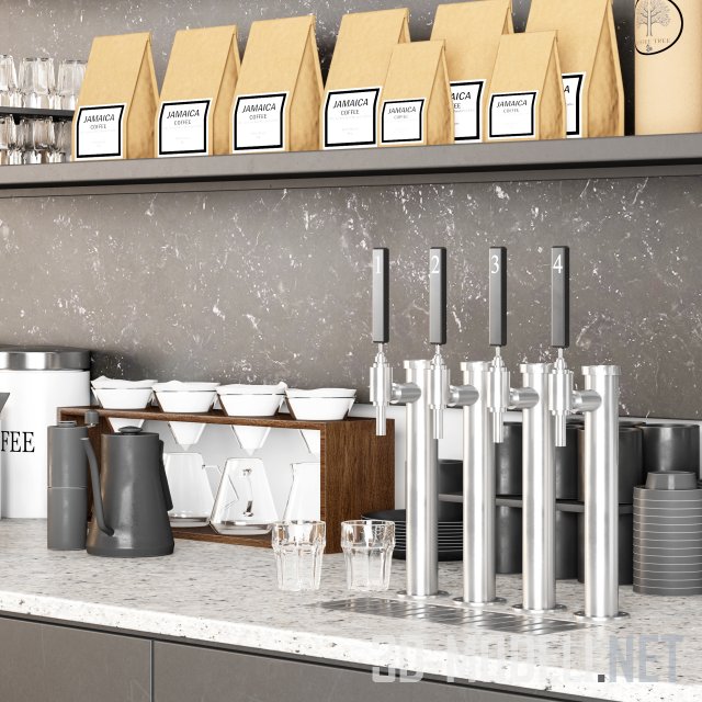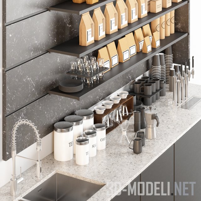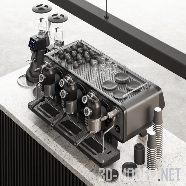 Стильный и современный фрагмент кафетерия, со стойкой и оборудованием. Это кофемашина SANREMO OPERA, кофемолка SANREMO SR 83 OD, различные сорта кофе, предметы посуды, выпечка и пр.