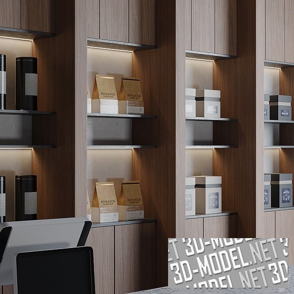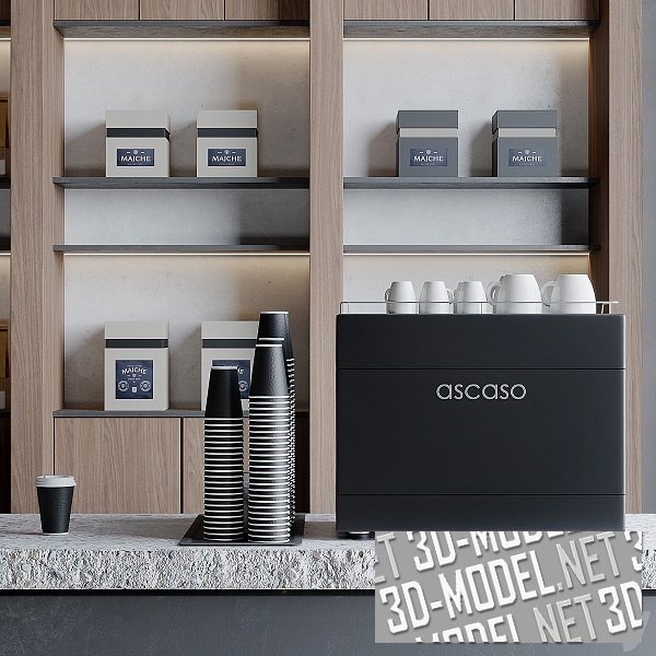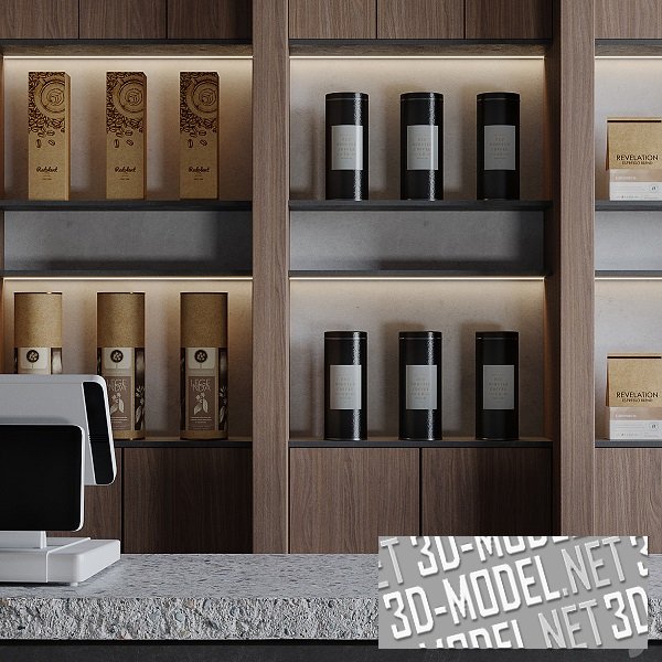 Графитово-серая стойка кофейни Morecoffee с бетонной столешницей и деревянными полками. На полках с подсветкой - коробки и банки с кофе. На столешнице - современная кофемашина «Ascaso», одноразовые стаканчики, чашки, кассовый терминал. На передней плоскости стойки - светящаяся надпись: «MORECOFFEE». Габарит кафетерия: 400х300см. Блок прекрасно подойдет для размещения на территории супермаркета, кинотеатра или торгового центра.