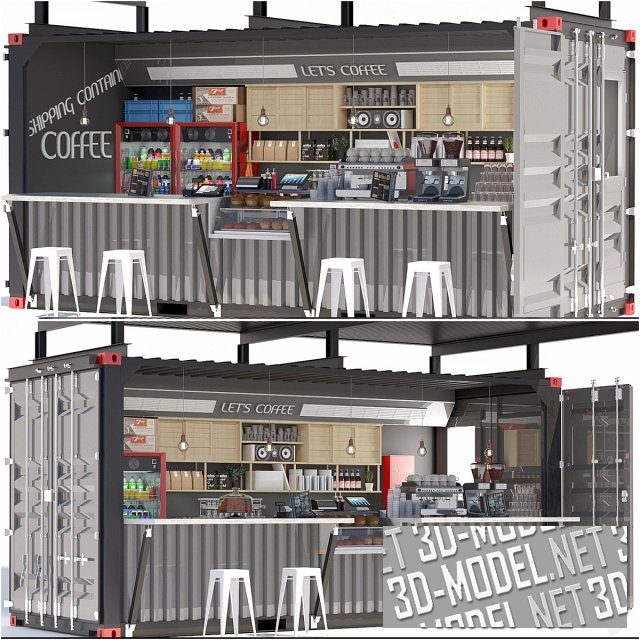 Полноценный современный кафетерий, с оборудованием, мебелью и продуктами. В холодильниках соки и выпечка, на полках напитки. Простые, но удобные табуреты ждут посетителей.