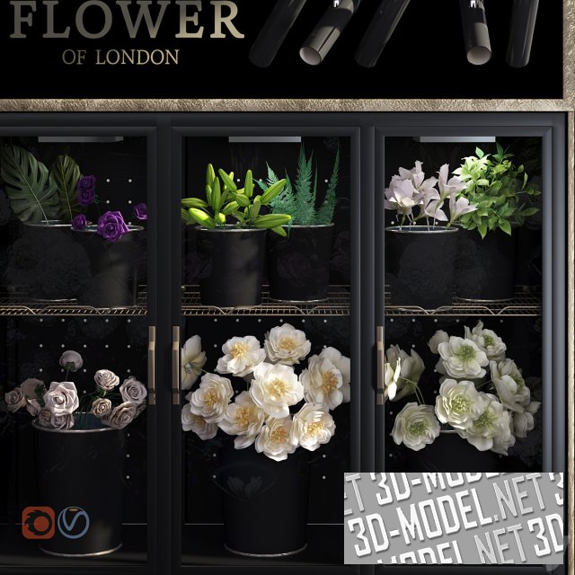 Торговая точка, торгующая цветами для размещения на территории крупного торгового центра. Витринная стойка с прилавком (под стеклом - черные контейнеры с небольшими комнатными растениями), полки с упаковкой и декором, закрытые стеклянными витринами в черных рамках витринные холодильники с цветами (розами, лилиями, пионами, листьями монстеры) и рекламная панель с надписью «Flower of London» золотистыми буквами по черному фону с золотистой рамкой. Трековые черные софиты, размещенные на горизонтальной шине, создают локальные пятна света на черных с золотистым витринах и прилавке.