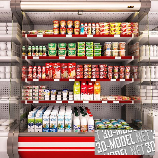 Три холодильных витрины Fortuna для создания различных проектов магазинов розничной торговли. В одном холодильнике на полках стоят яркие баночки, бутылки, тетрапаки и лежат пакеты с молоком, йогуртами и различными молочнокислыми продуктами.