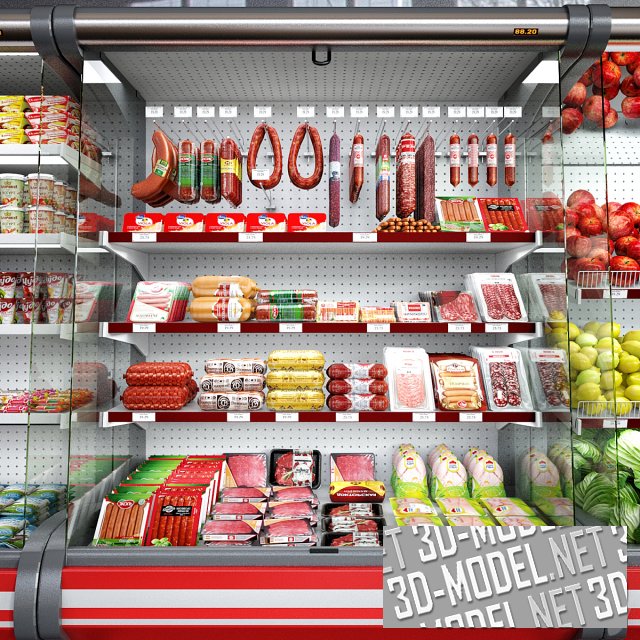Полки второго холодильника заложены всевозможными аппетитными мясными продуктами: колбасной нарезкой, колбасами различных сортов и др. В третьем холодильнике привлекательными яркими горками лежат овощи и фрукты: пекинская и белокочанная капуста, картофель, помидоры, огурцы, чеснок, бананы, лимоны, апельсины, яблоки и груши.