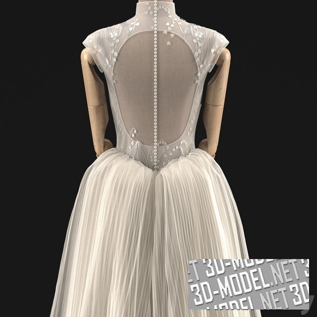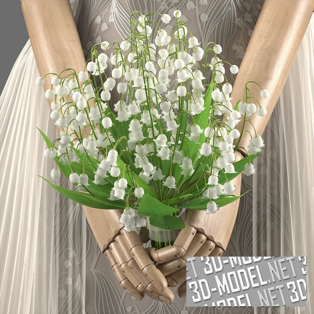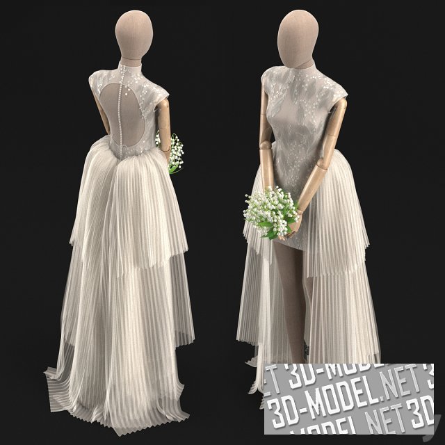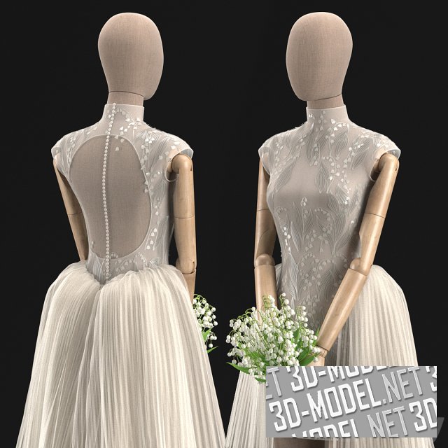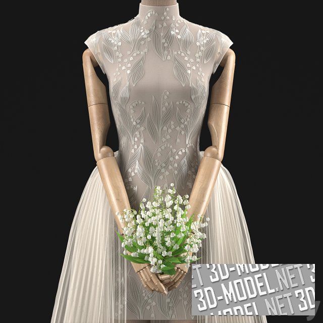 Упрощенный женский манекен с подвижными конечностями на шарнирах, одетый в красивое современное свадебное платье. Платье с глухой горловиной, без рукава, с полупрозрачным овальным вырезом на спине, сшито из белой ткани с белыми и серебристыми растительными мотивами из стилизованных ландышей. К талии платья пришита каскадом из двух уровней (до бедер и в пол) плиссированная юбка. Спереди юбка открывает низ короткого платья, стройные ноги невесты и белые туфельки. В руках у манекена букет из ландышей, перекликающийся с мотивом на ткани платья.