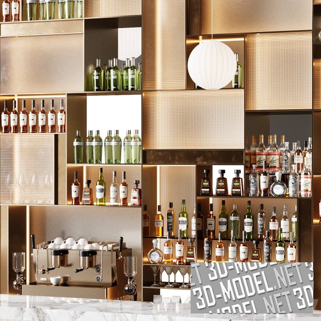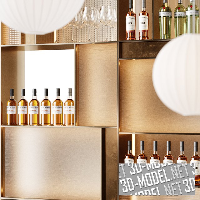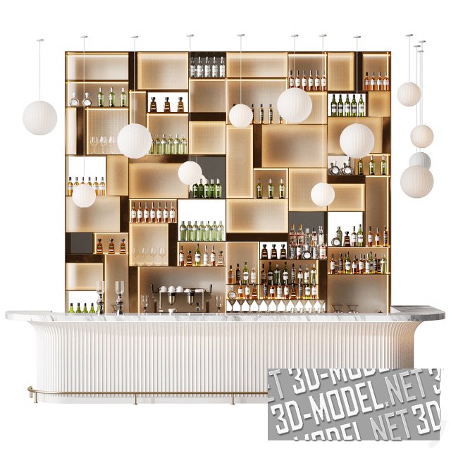 Стильный и современный бар с приятным дизайном. Задняя стенка состоит из комбинации открытых и закрытых секций, что создает интересный эффект и делает конструкцию функциональной. Яркость и динамизм бару придают подвесные светильники с абажурами-шарами.