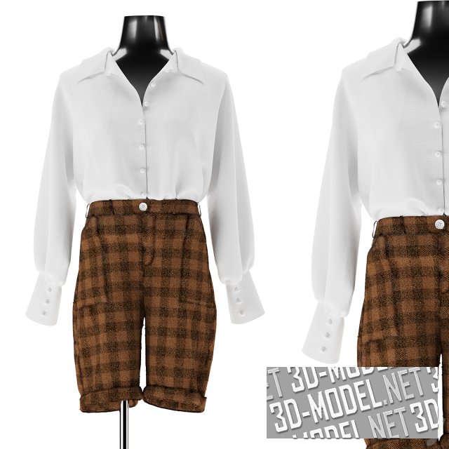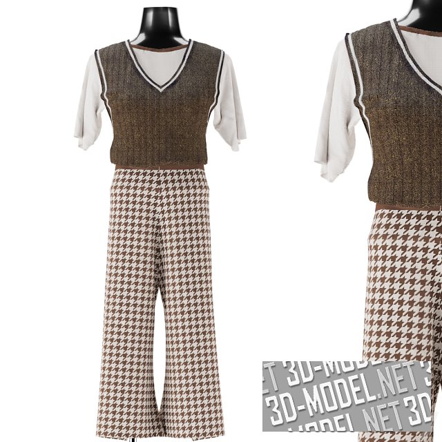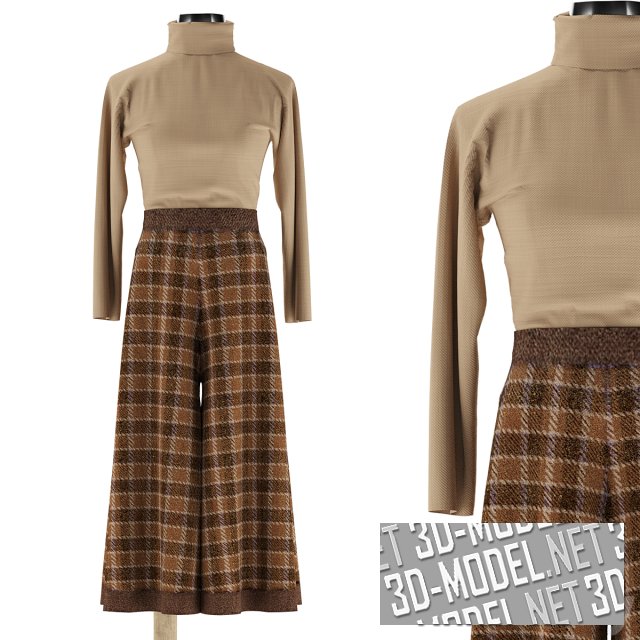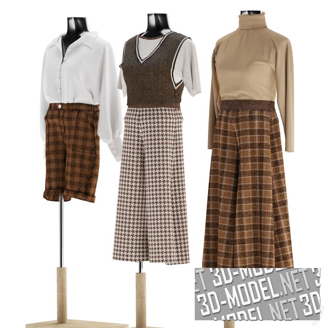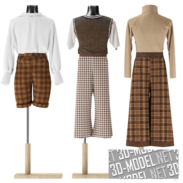 Три манекена (размер 174.17 x 39.46 x 172.6 см). На них показана верхняя одежда в бежево-коричневой гамме: брюки, бриджи, жилетка и пр.