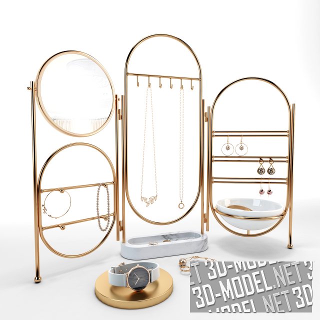 Наполнение витрины ювелирного магазина, с золотистыми металлическими стойками, подставками и изделиями. Изящная стойка сделана из золотистых полированных трубок, соединенных шарнирами в трех секционную арочную «ширму». В каждой из трех секций оборудованы свои штанги и крючки. На левой части смонтировано круглое зеркало. В нижней части центральной секции смонтирован белый мраморный овальный лоток. В правой секции обустроена керамическая белая полусфера тарелочки. Небольшая коллекция ювелирных изделий из золота и камней (наручные часы, браслеты, серьги, кулоны и подвески на цепочках, жемчужные бусы) размещена на стойке и под ней.