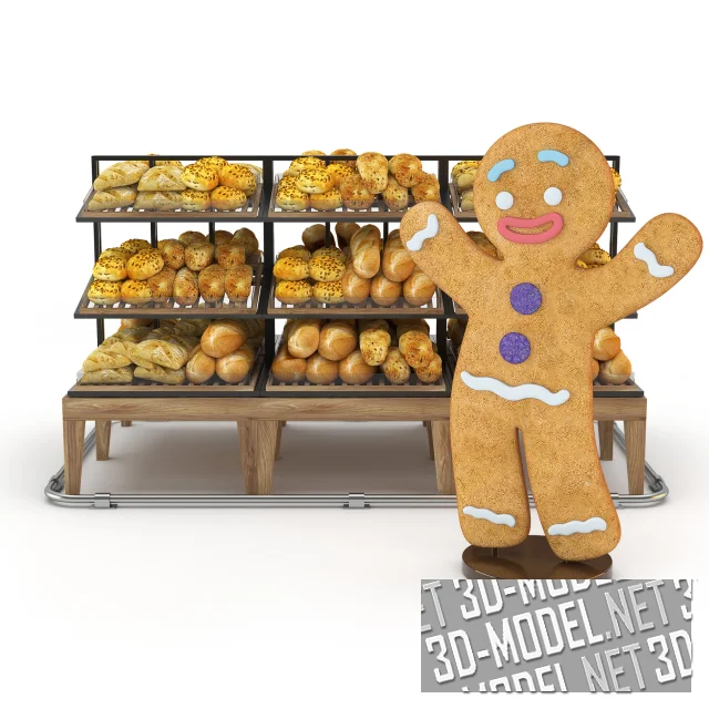 Реалистичный стеллаж с аппетитными хлебо-булочными изделиям. Размер витрины: 2350 х 1400 х 1350 мм. Рядом в рекламных целях размещен Пряня - пряничный человечек- печенье. Его высота 1500 мм.