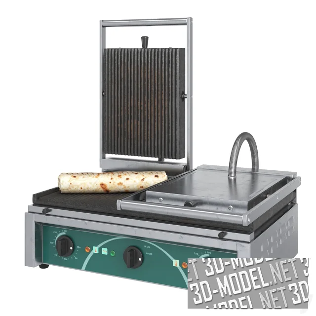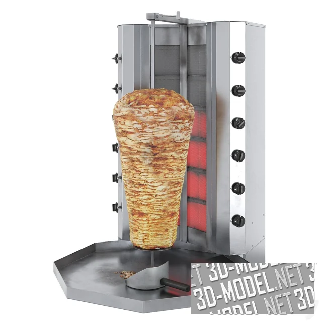 Современное оборудование для производства шаурмы в небольшой точке быстрого питания. В наборе: металлический зонт с вытяжкой, газовая установка для приготовления шаурмы с мясной заготовкой на вертикальном шампуре, цилиндрический настольный электрокипятильник, плитка для финального подогрева свернутой шаурмы, установка для приготовления картошки-фри.
