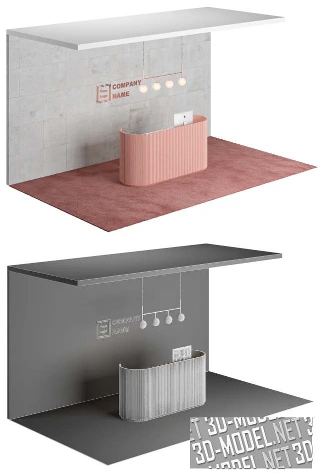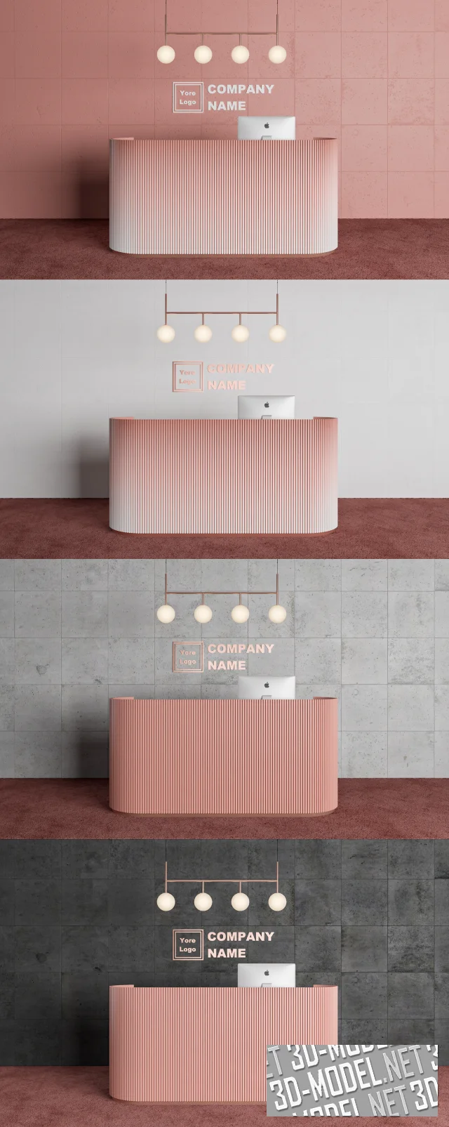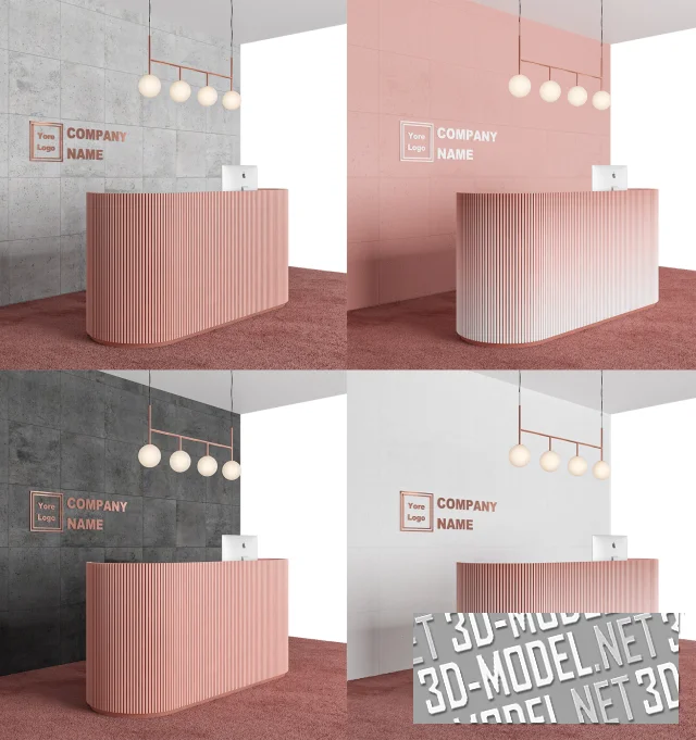 Передняя плоскость представлена в двух вариантах: кораллово-розового цвета и с деграде от розово-кораллового сверху к белому внизу. Стена за стойкой декорирована квадратной плиткой в четырех вариантах: белая, светло-серая, темно-серая, кораллово-розовая. На стене смонтирован полуобъемный логотип. Над стойкой - подвесной светильник с четырьмя белыми матовыми шаровидными плафонами на металлической конструкции. На полу темный кораллово-розовый ковролин.