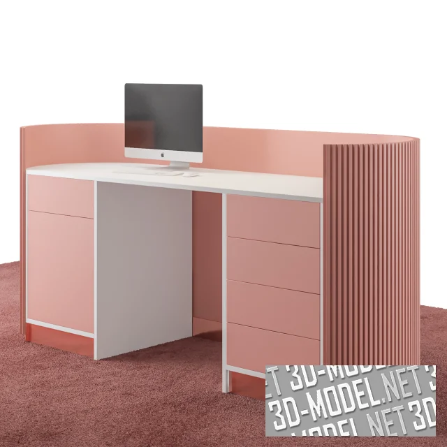 Небольшая современная стойка для администратора, декорированная вертикальными канавками по наружной плоскости. Внутреннее пространство организовано следующим образом - белая столешница опирается на две тумбы с пространством между ними. В тумбах выдвижные ящики (четыре в правой и один в левой) и створка (в левой). На столешнице размещен монитор компьютера от Apple. Фасады выдвижных ящиков и створка светлого розово-кораллового цвета.