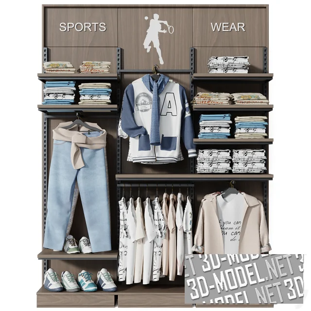 Современная система модульных полок, собранная в витрину с одеждой и обувью. На верхней части панели задней стенки стеллажа с текстурой дерева нанесено изображение в виде силуэта игрока в теннис и надпись «SPORTS WEAR». На асимметричных полках и вешалках сложенные футболки, висящие брюки, блузки, кофты. На нижних полках кроссовки.